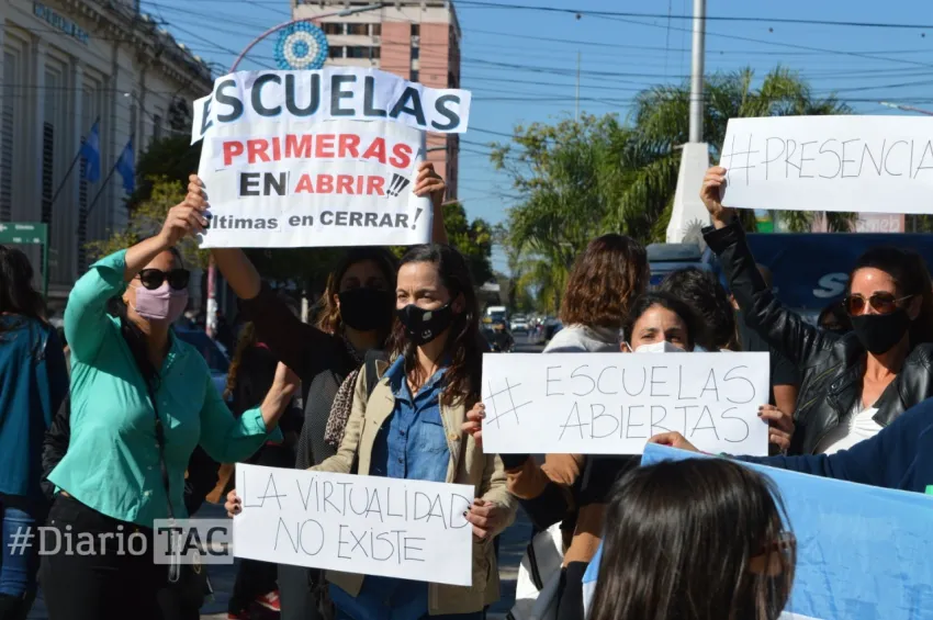 Con carteles, globos y banderas de Argentina, se hicieron presentes frente al mástil de la avenida 9 de Julio, en la plaza 25 de Mayo, para reclamar a las autoridades del Gobierno una solución ya que señalaron que "los chicos están sufriendo" y remarcaron que "se nota que el nivel de aprendizaje es distinto –con la virtualidad".