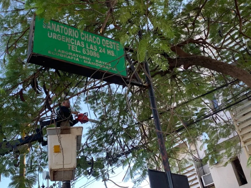 Frente al Sanatorio Chaco Oeste, ubicado en avenida Marconi al 1486, se llevó a cabo la poda controlada de un árbol que interceptaba con líneas aéreas y estaba cerca de un transformador que producía inconvenientes al sanatorio, como así también la recolección de ramas y hojas. Este operativo se encuentra dentro de la planificación de saneamiento de temporada estacional que incluye 14 sectores de Resistencia de forma simultánea.