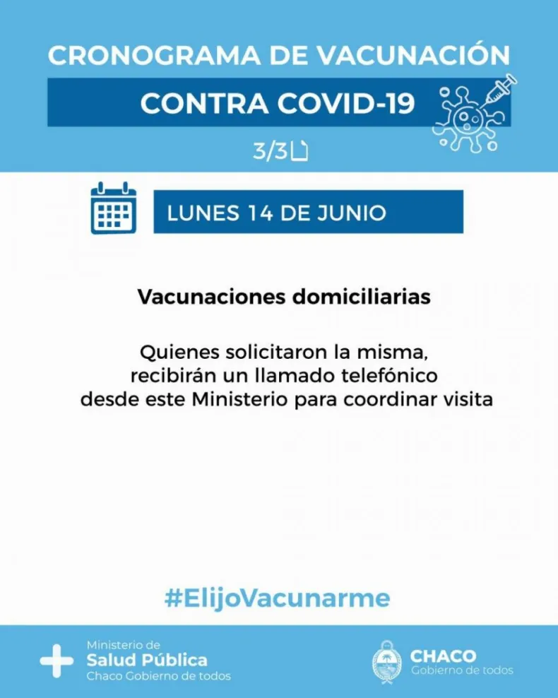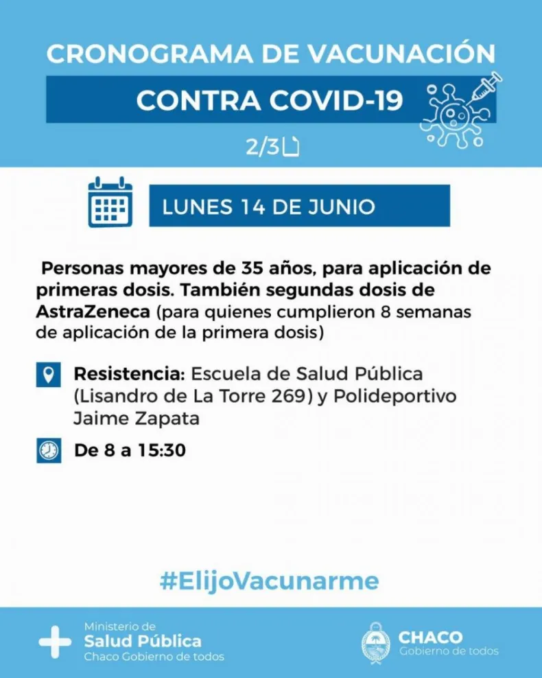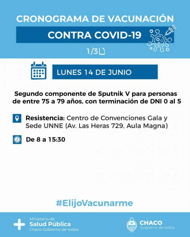 El Ministerio de Salud Pública de la provincia informó quiénes serán las personas que podrán ser inoculadas hoy. Esta mañana los mayores de 75 a 79 podrán recibir la segunda dosis de la Sputnik V en el Centro de Convenciones Gala o en la UNNE, aunque solo quienes tengan terminación 0 a 5 en sus documentos.