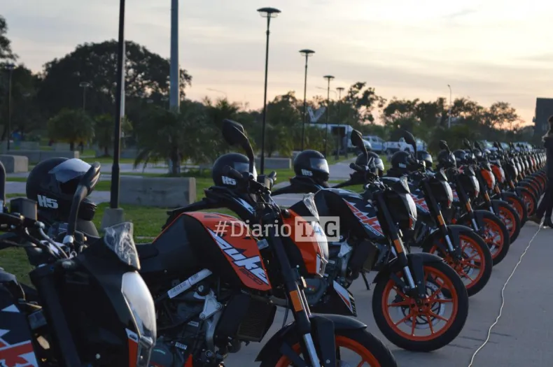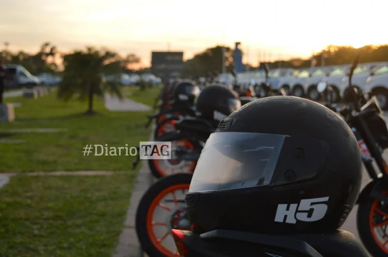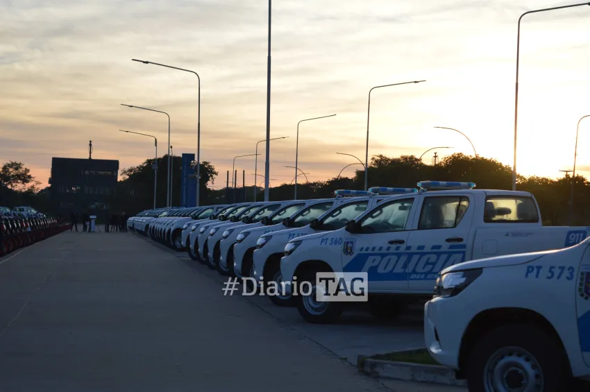 Durante el acto, en el que participó la vicegobernadora Analía Rach Quiroga, la ministra de Seguridad Gloria Zalazar, el ministro de Economía Santiago Pérez Pons y el jefe de la Policía Ariel Acuña entregaron 119 camionetas, más de 100 motos.