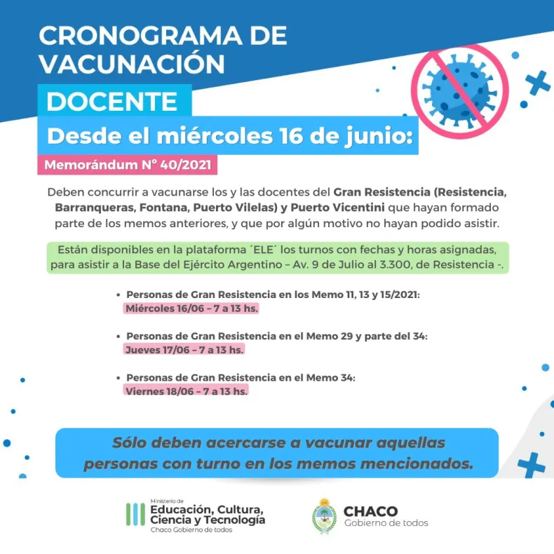 El Ministerio de Educación, a través de la Subsecretaría de Planificación del Sistema Educativo, emitió el Memorándum Nº 40/2021, que establece que a partir de este miércoles 16 de junio las y los docentes, y trabajadores y de la educación de Resistencia, Barranqueras, Fontana, Puerto Vilelas y Puerto Vicentini, que hayan formado parte de los memos anteriores y no hayan podido asistir, concurran a vacunarse contra el COVID -19.