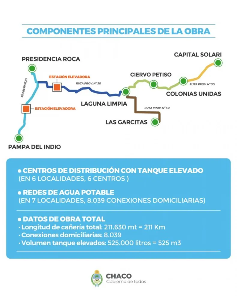 El Ministerio de Obras Públicas de la Nación realizó el llamado a licitación pública para la ejecución de las obras del sistema de distribución de agua potable para siete localidades del interior del Chaco. Se trata del acueducto que distribuye agua segura a Capitán Solari, Colonias Unidas, Las Garcitas, Ciervo Petiso, Laguna Limpia, Presidencia Roca y Pampa del Indio.