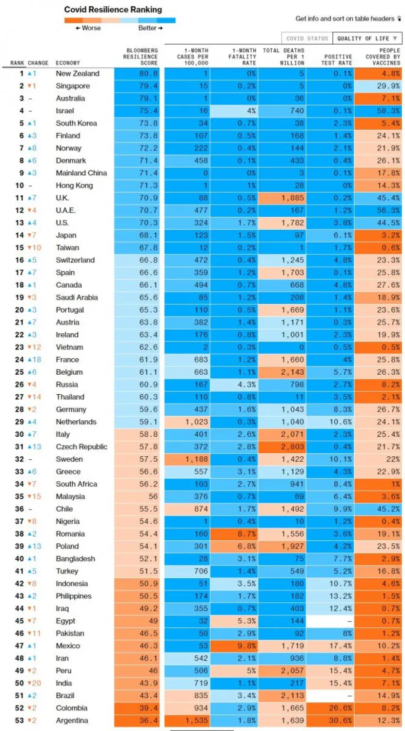Se trata del "Ranking de Resiliencia", elaborado por la agencia Bloomberg, que utiliza una amplia variedad de datos para determinar dónde se está manejando la pandemia de manera más efectiva, con los menores problemas sociales y económicos- y evalúa estadísticas de parámetros tales como la tasa de mortalidad, la cantidad de testeos, la tasa de positividad, el acceso a la vacuna, la severidad en las restricciones a la circulación y la evolución del PBI.