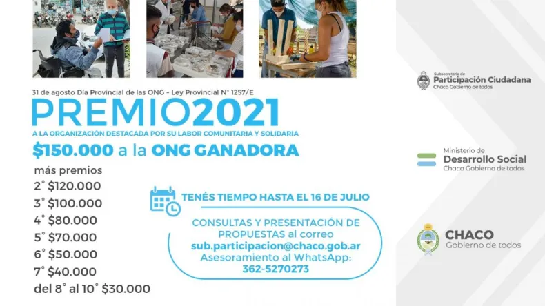El Ministerio de Desarrollo Social abrió la convocatoria para participar del Premio Provincial a la ONG Destacada por su Labor Comunitaria y Solidaria Año 2021, a través de la cual el Gobierno del Chaco otorga estímulos económicos a las organizaciones seleccionadas. El primer premio para la organización elegida será de 150.000 pesos.