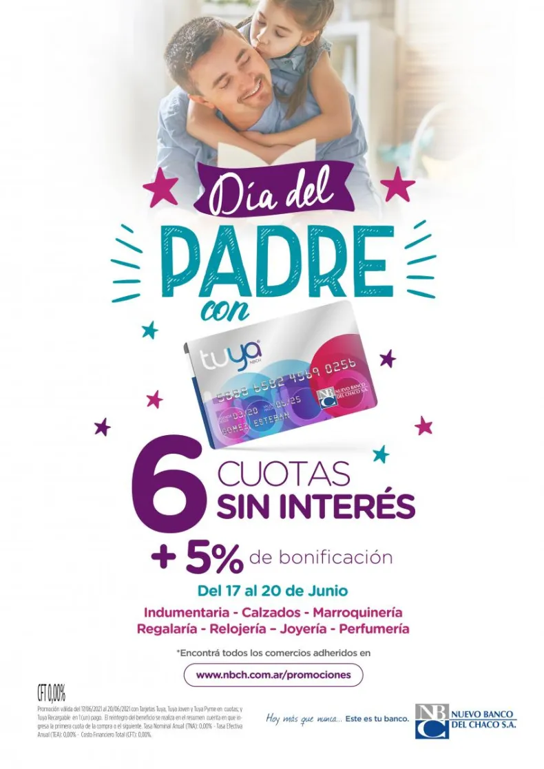 Tarjeta Tuya, marca propia del Nuevo Banco del Chaco, tendrá una promoción especial para celebrar el Día del Padre. Desde el jueves 17 y hasta el domingo 20, se podrá comprar en 6 cuotas sin interés con 5% de bonificación y sin tope de reintegro en más de 4.000 comercios de toda la provincia.