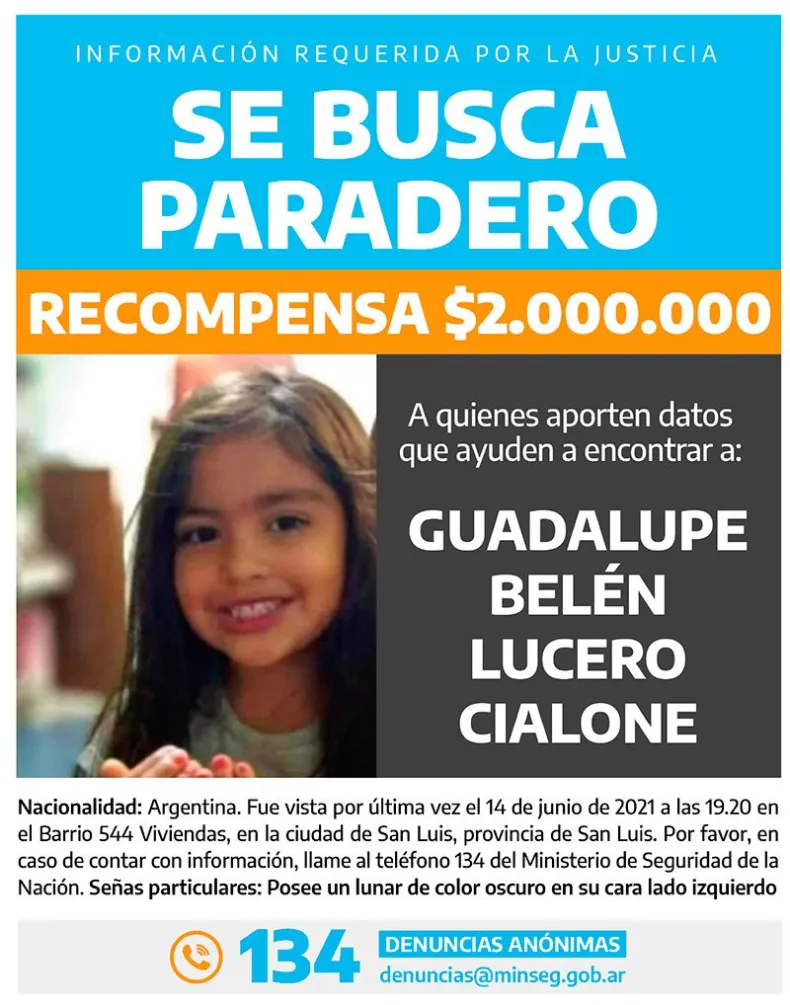 El Gobierno decidió ofrecer una recompensa de $2.000.000 para quien aporte información que ayude a encontrar a Guadalupe Belén Lucero, la niña de cinco años que es intensamente buscada desde el lunes pasado en la provincia San Luis, donde desapareció mientras jugaba con sus primos en la calle. El incentivo económico fue anunciado en la Resolución 289/2021, publicada este viernes en el Boletín Oficial.