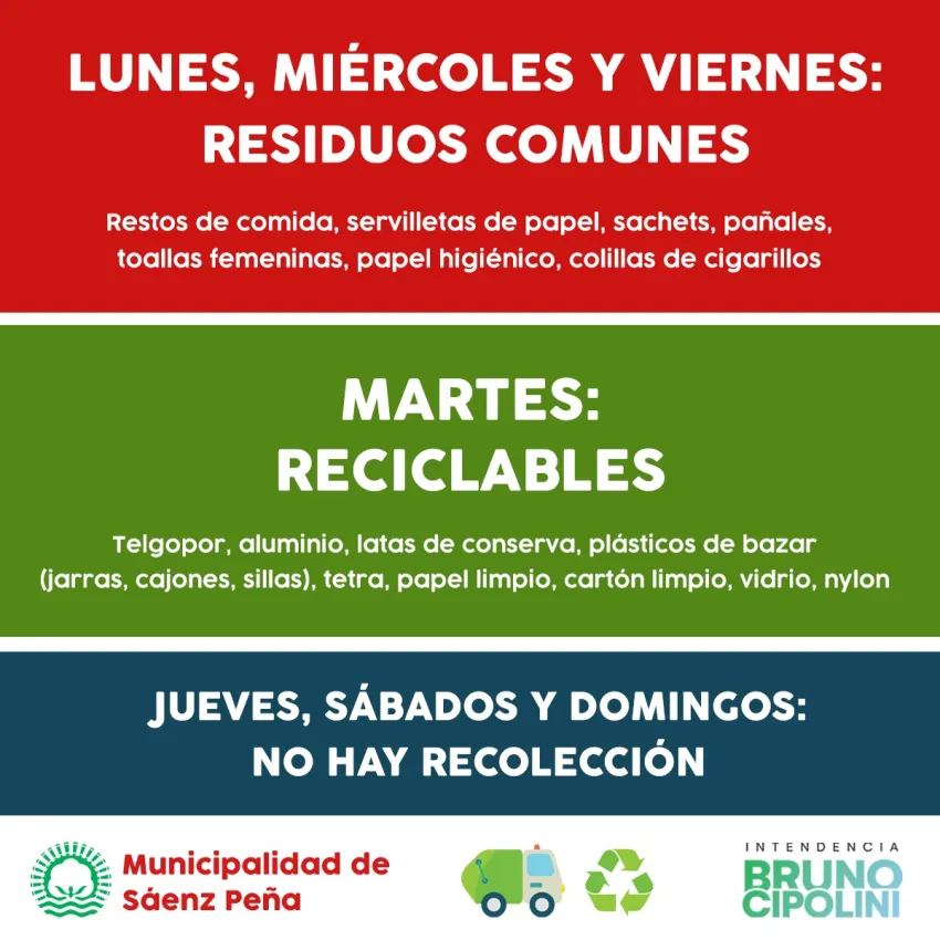 A pesar del feriado del lunes 21 de junio, el cronograma de recolección de residuos no sufre modificaciones, manteniéndose de la siguiente manera:Lunes, miércoles y viernes: Residuos comunes.Martes: Reciclables.
