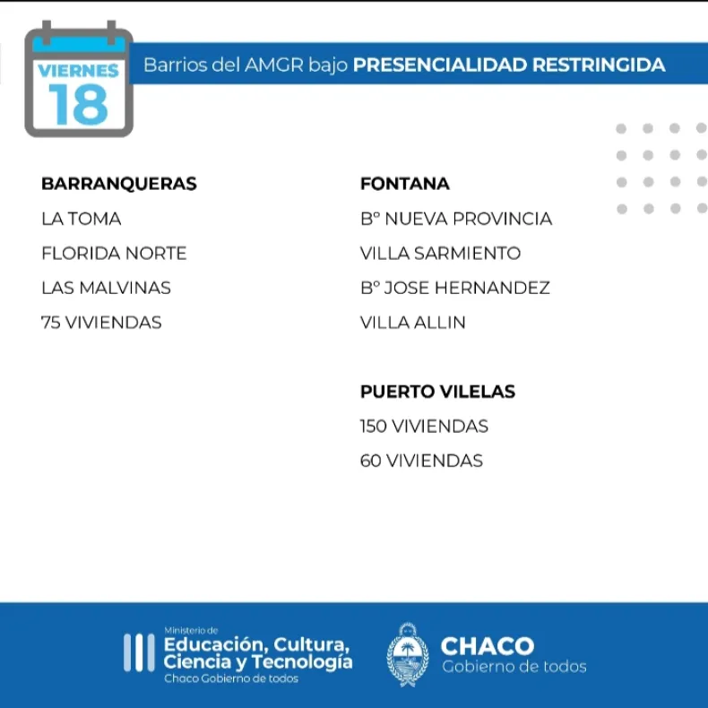 Los barrios del Gran Resistencia con presencialidad restringida hasta el viernes 25 son: en Resistencia, Palermo I y II, Villa Libertad, Villa Don Alberto, Villa Facundo, Villa El Dorado, Villa Centenario, San Miguel, Villa del Oeste, Villa Don Enrique, Villa Adelante, Villa 25 de Mayo y Pezzini, Villa Perrando, Villa Domingo, Villa Encarnación, Villa Ávalos, Villa Odorico, Plan 96 Viviendas SEJCH, Plan 56 Viviendas SEJCH, Vargas II, Villa Prosperidad, Villa Don Rafael, Barrio Central Norte, Villa Los Lirios, Villa San Juan, Villa Elisa, Villa Teniente Saavedra, Villa General Mitre, Golf Club, Villa Donovan, Roger Balet, Villa Mariano Moreno, Villa Aeropuerto, Centro 3 (delimitado por las avenidas Alberdi, Alvear, Hernandarias/Avalos, Lavalle/Laprida, Vélez Sarsfield y 9 de Julio), Villa El Tala y Villa Juan de Garay. En Barranqueras, barrio La Toma, Florida Norte, Las Malvinas y 75 Viviendas. En Fontana, Barrio Nueva Provincia, Villa Sarmiento, Barrio José Hernández y Villa Allín. En Puerto Vilelas, los barrios 150 Viviendas y 60 Viviendas.
