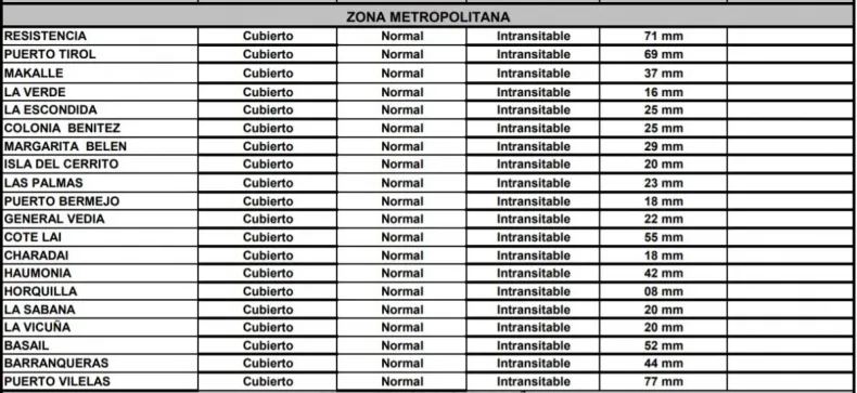 Varios caminos del Gran Resistencia están intransitables y es producto de la gran cantidad de agua caía en pocos minutos. Vilelas, Resistencia y Puerto Tirol fueron las ciudades con mayor cantidad de agua caída de la zona metropolitana, con 77mm, 71 mm y 69 mm respectivamente.