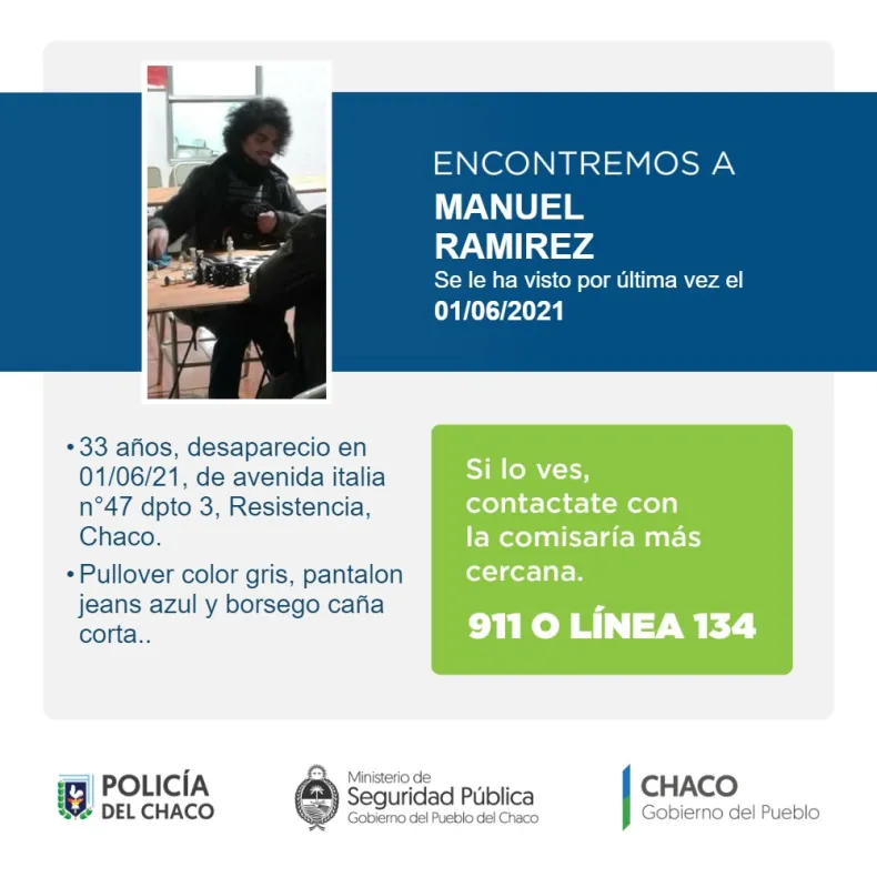 Cualquier novedad sobre Manuel Ramírez, acercarse a la unidad más próxima a su domicilio o comunicarse por teléfono con la Comisaría Tercera de Resistencia al número 3624452907 o llamar al servicio de emergencias 911.