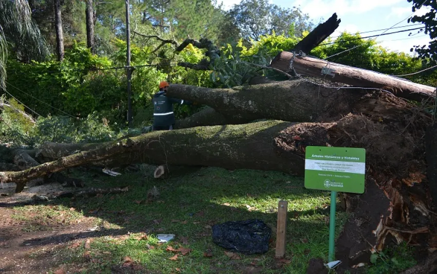 El subsecretario de Sistema Lacustre y Pulmones Verdes, Matías Arce, explicó que el árbol cayó por los fuertes vientos de la tormenta de este miércoles y también padecía una colonia de termitas en la parte baja. Asimismo, aseguró: "Tras el temporal, se tuvieron que detener los operativos de poda controlada y atender los retiros de ramas grandes y árboles caídos que en esta oportunidad no afectaron viviendas ni autos y solo perjudicaron al sistema de cableado y ocasionaron postes caídos".