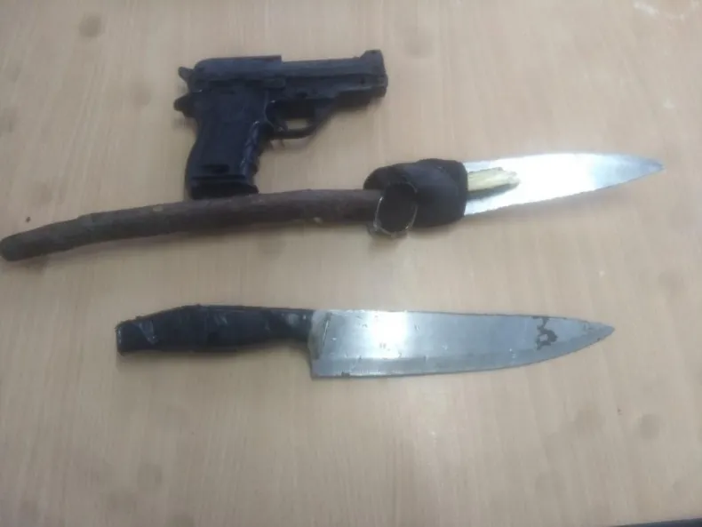 En poder de los detenidos, secuestraron dos armas blancas tipo cuchillo y una réplica de arma de fuego tipo pistola de plástico color negra.