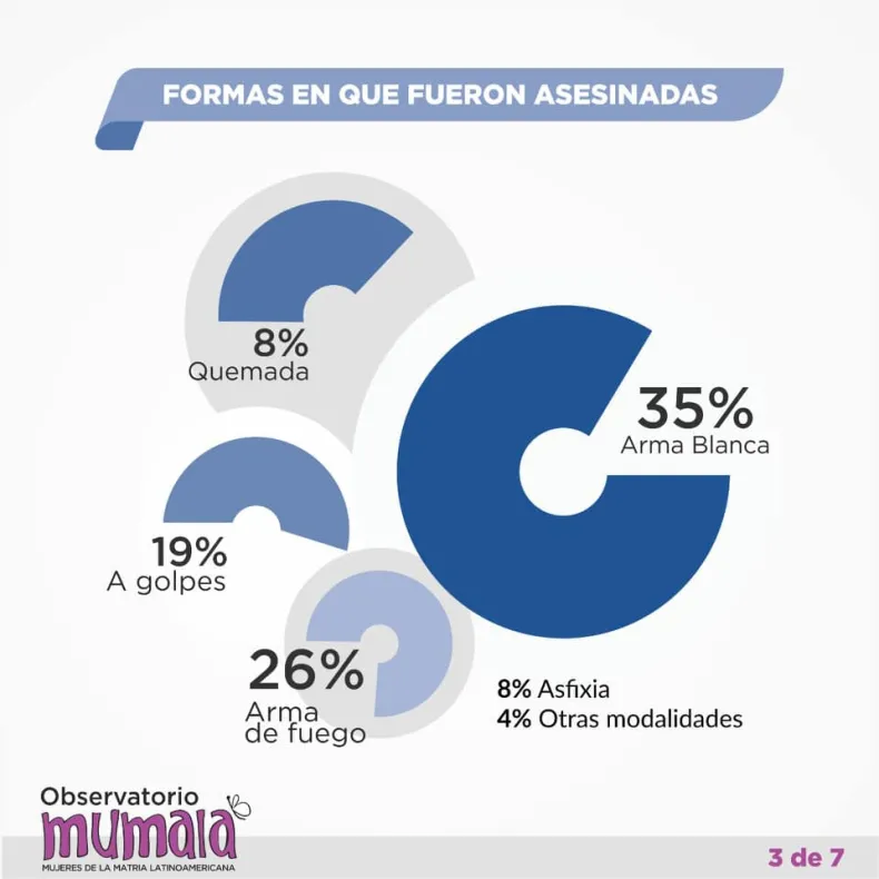 En cuanto a los 107 femicidios, MuMaLa precisó que hubo uno cada 40 horas y que 85 fueron directos; 4 fueron vinculados de niñas/mujeres; 13 fueron vinculados de niños/varones (5 por interposición en el hecho violento); y 5 fueron trans-travesticidios.