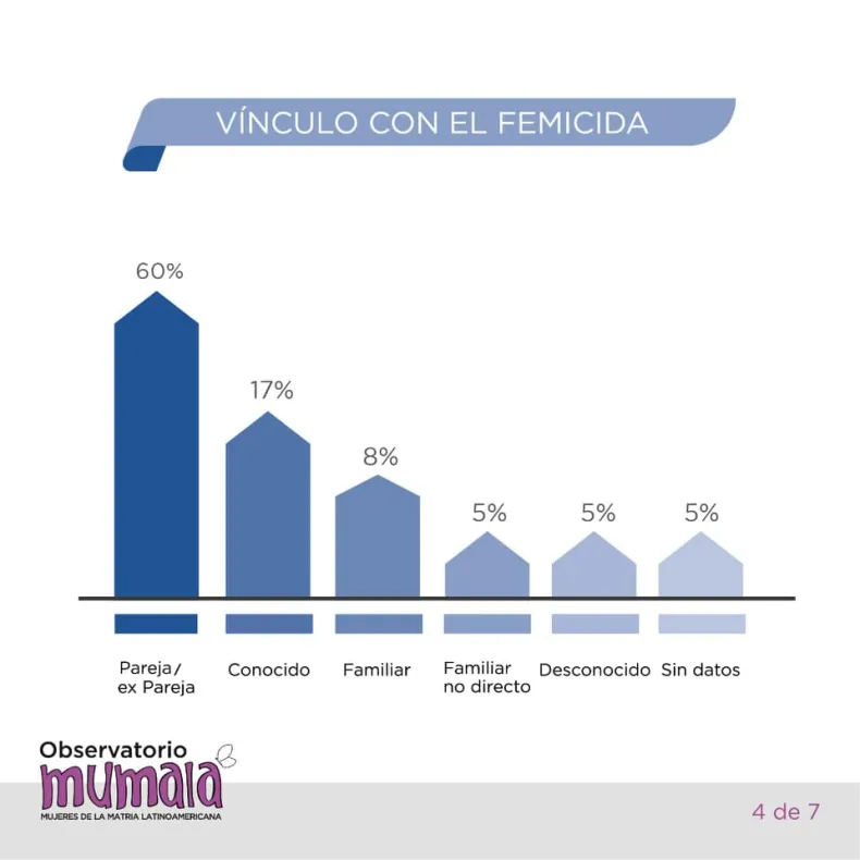 Por otro lado, el 90% de los femicidios fue perpetrado por alguien que conocía a la víctima; el 60% era pareja o ex pareja; el 13% fue perpetrado por integrantes de las fuerzas de seguridad; y el 32% fue cometido con armas de fuego.