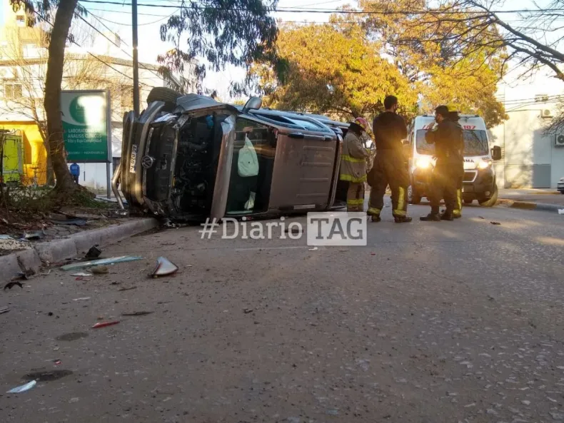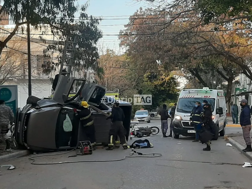 En las primeras horas de la mañana se produjo un violento choque entre una camioneta y una moto, el vehículo de mayor porte es el que terminó volcando y dejando atrapada a la persona que lo conducía y a su acompañante. El siniestro se produjo en la intersección de la calle Monteagudo y Brown.