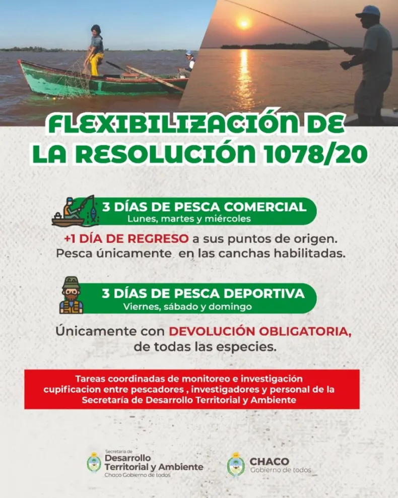 La Comisión de Pesca del Consejo Provincial del Ambiente, dependiente de la Secretaría de Desarrollo Territorial y Ambiente, resolvió flexibilizar la Resolución 1078/20 que decretaba que con una altura del río por debajo del metro rige la veda total en todo el territorio. Ahora, los pescadores, tanto comerciales como deportivos, tendrán 3 días a la semana para pescar.