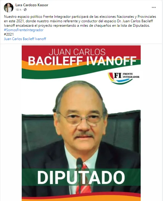 En época de elecciones muchos de los partidos políticos comienzan a mover piezas y a poner en la lista de representación a sus máximos referentes. En este sentido, no es la excepción del partido Frente Integrador quien a través de las redes sociales anunció que el ex vicegobernador de la provincia, Juan Carlos Bacileff Ivanoff encabezará la lista de diputados nacionales.