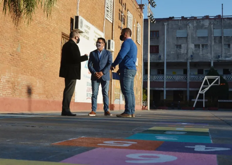 El Intendente recorrió el patio de la tradicional escuela cercana al Municipio y observó el uso recreativo que los alumnos le dieron a esas formas artísticas pintadas tanto sobre el suelo de la cancha de fútbol, como así también en paredes cercanas.