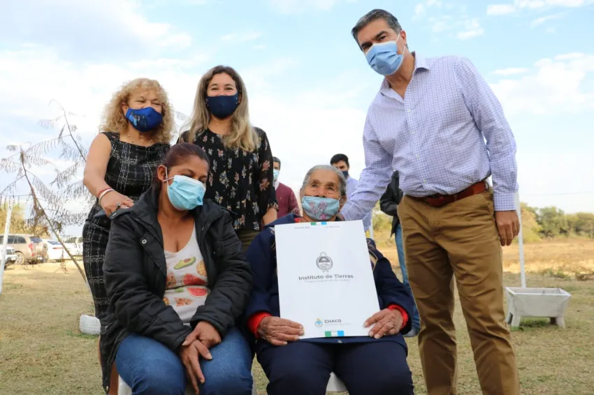 El gobernador Jorge Capitanich entregó, este sábado junto a la secretaria de Desarrollo Territorial y Ambiente Marta Soneira, 22 títulos de propiedad rural en General San Martín y otros nueve en Colonias Unidas a pequeños productores de la zona. El objetivo del gobierno es alcanzar 4.000 títulos para el 2023. "La tierra es de quien la trabaja y debe estar en función social, por eso estamos haciendo un gran esfuerzo para regularizar la situación de las y los productores de la provincia", señaló.