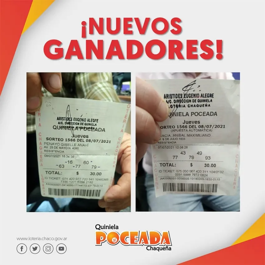 Dos jubilados, uno Fontana y otro de Resistencia, se presentaron esta mañana en las oficinas de Lotería Chaqueña para hacer efectivo el cobro de sus respectivos premios, ya que ambos resultaron ganadores durante la edición de la Quiniela Poceada Chaqueña del pasado jueves 8 de julio.