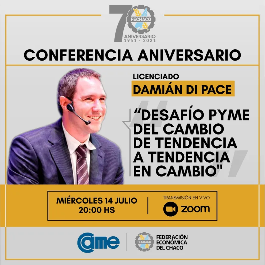 Continuando con las actividades que viene desarrollando la Federación Económica del Chaco (FECHACO) por su 70º aniversario, la entidad empresaria invita a la conferencia virtual "Desafío Pyme: Del Cambio de Tendencia a Tendencia en Cambio", a cargo del licenciado Damián Di Pace. La charla es totalmente gratuita y requiere de inscripción previa.