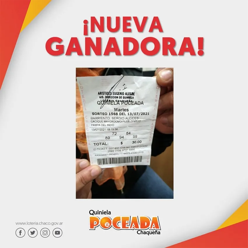 Una mujer de 38 años de Pampa del Indio se llevó un premio superior a los $3.600.000, del cual se había hecho acreedora durante la edición de la Quiniela Poceada Chaqueña del pasado martes 13.