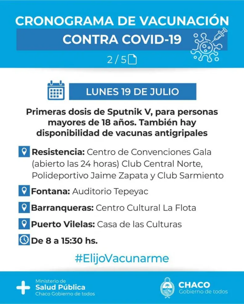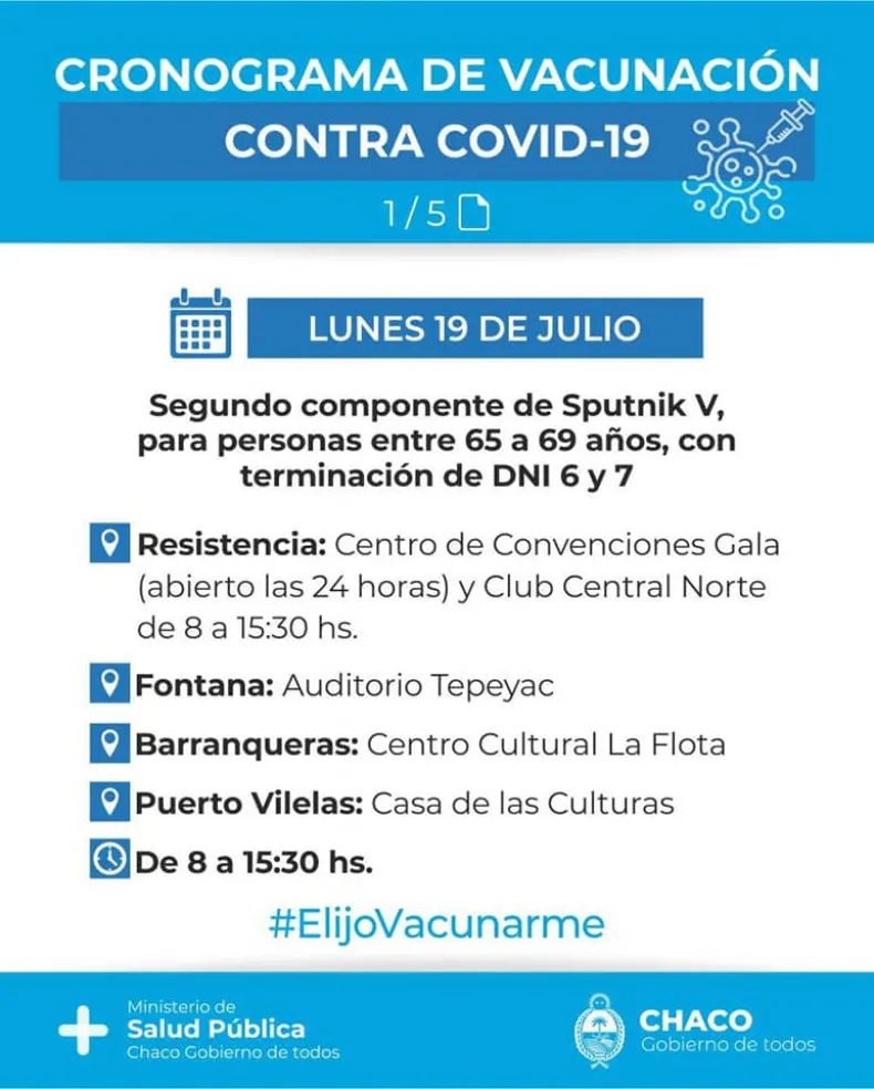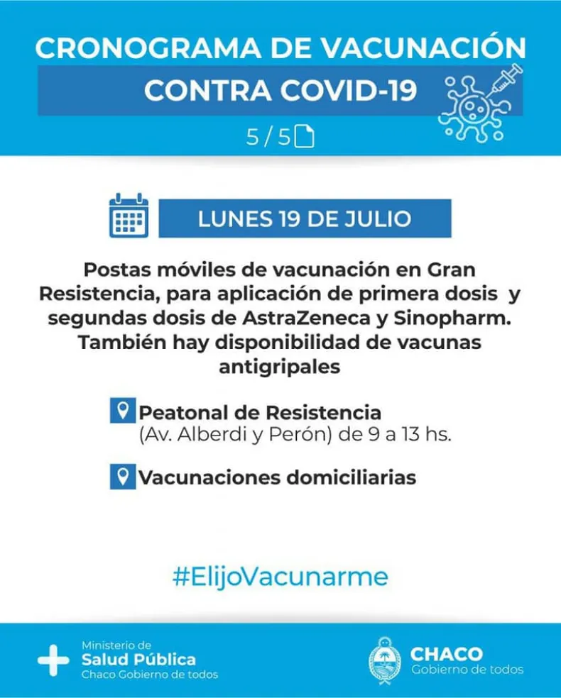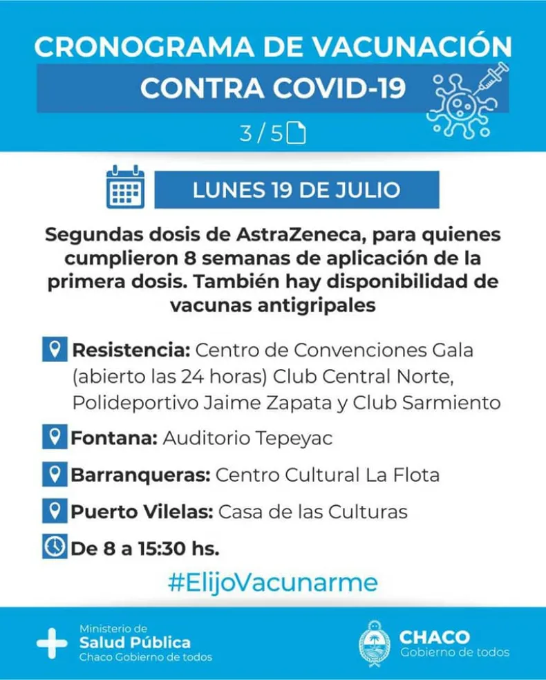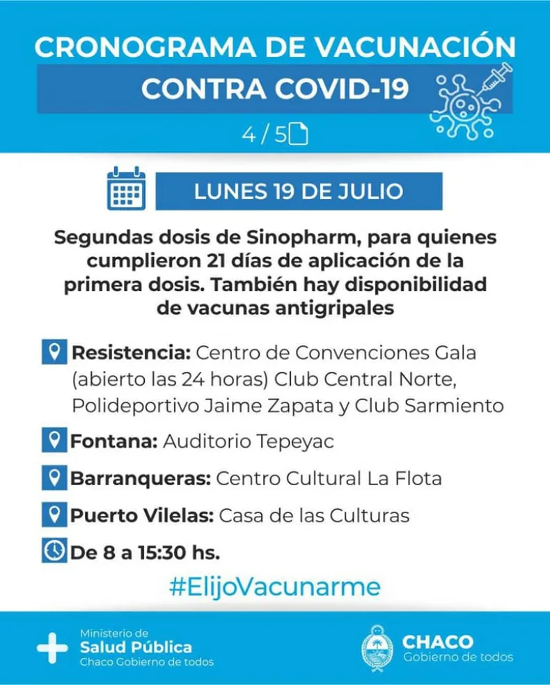 El Ministerio de Salud de Chaco dio a conocer el cronograma de vacunación para este lunes 19 de julio de las distintas dosis y componentes que se aplican en la provincia.