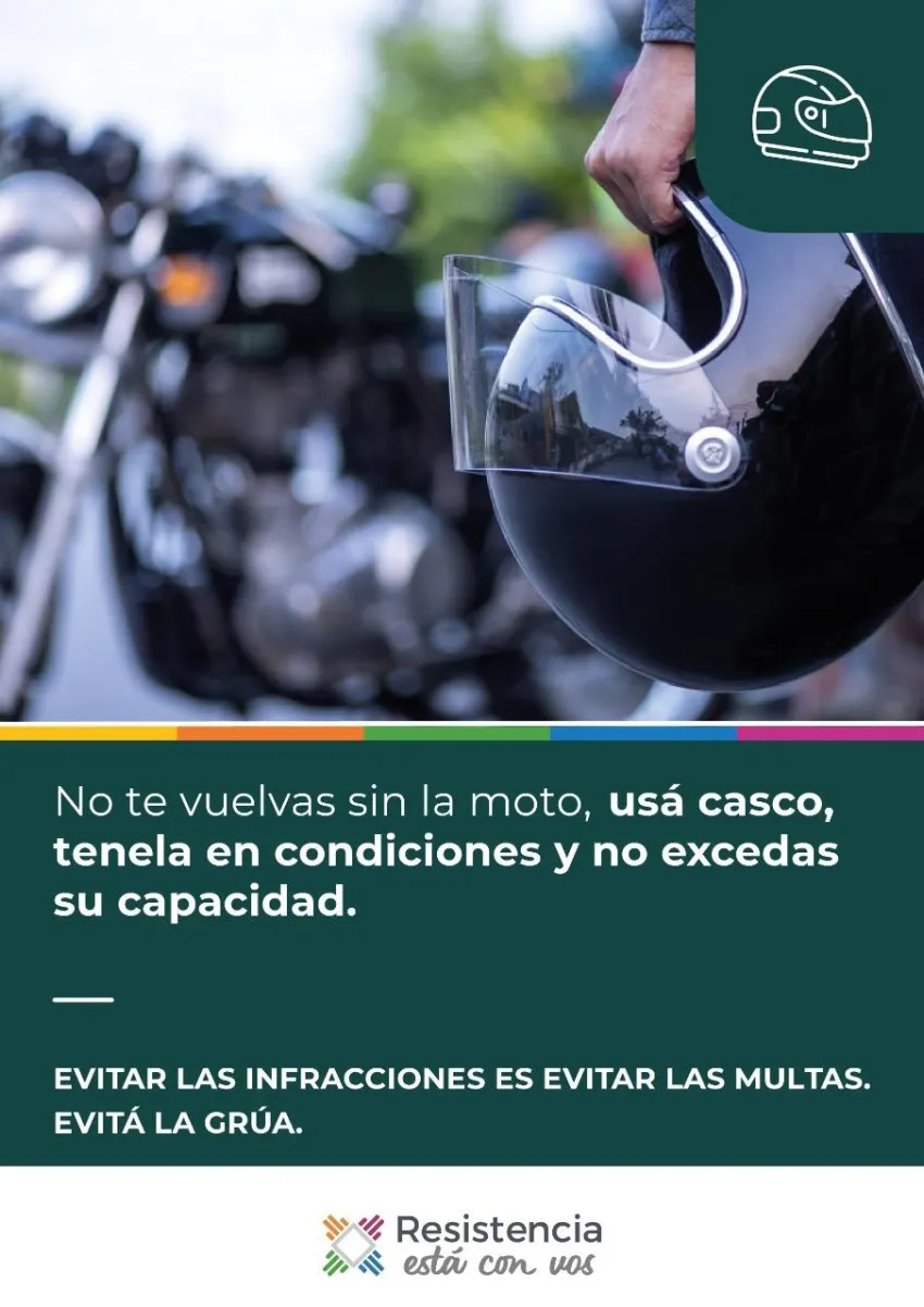 La Secretaría de Gobierno del Municipio de Resistencia lleva adelante una frase de concientización y prevención para motociclistas: "No te vuelvas sin la moto, usá casco, tenela en condiciones y no excedas su capacidad".