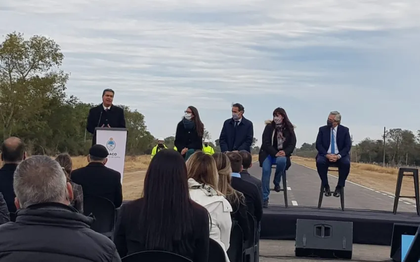 Autoridades de la Federación Económica del Chaco (FECHACO) y de la Confederación Argentina de Mediana Empresa (CAME) acompañaron este martes al presidente de la Nación, Alberto Fernández y al gobernador Jorge Capitanich en el acto de habilitación de la pavimentación de un tramo de la ruta 7 que une Presidencia de la Plaza y Colonias Unidas.