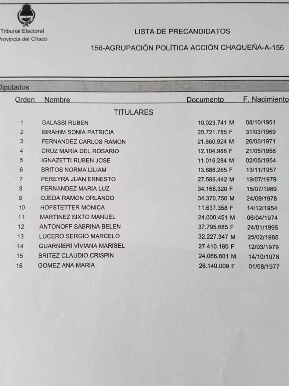 La lista de precandidatos a diputado de la Nación la encabeza el comisario retirado de la Policía del Chaco, Diario Cañete y la de los provinciales Rubén Galassi quien fue Convencional Constituyente de Acción Chaqueña.