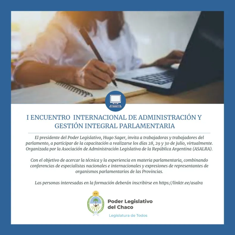 El presidente del Poder Legislativo, Hugo Sager, invita a trabajadores y trabajadoras del parlamento a participar de este ciclo de charlas y capacitaciones, que se generó con el objetivo de impulsar espacios de participación, intercambio y colaboración permanente para la reflexión, el avance del conocimiento, la construcción de redes y el desarrollo de proyectos a través de cuatro ámbitos de actuación: investigación, docencia, extensión académica y asistencia técnica en los ámbitos de los poderes legislativos del país.