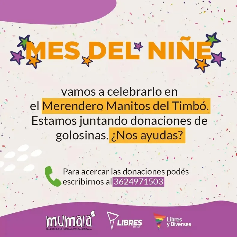 Los interesados en colaborar con esta campaña organizada por Mujeres de la Matria Latinoamericana (MuMaLa), Libres del Sur y Libres y Diverses pueden contactarse por teléfono al número 3624971503.
