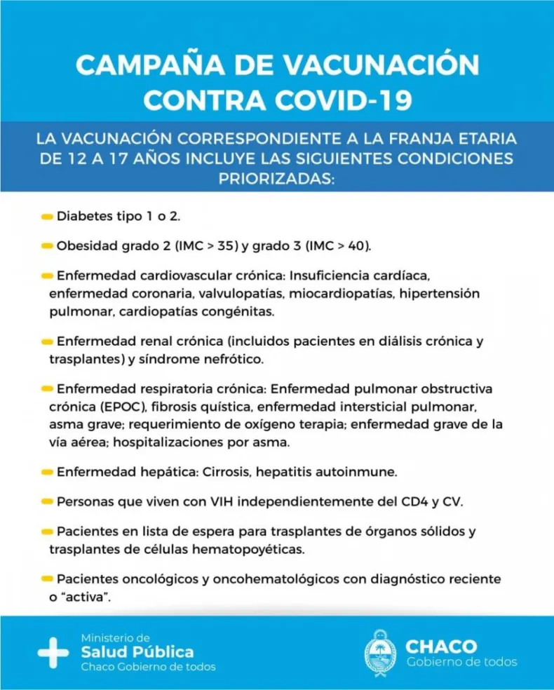 Asimismo, desde la cartera de Salud publicaron un listado de las enfermedades de base o condiciones que serán prioritarias para la vacunación de niños, niñas y adolescentes.