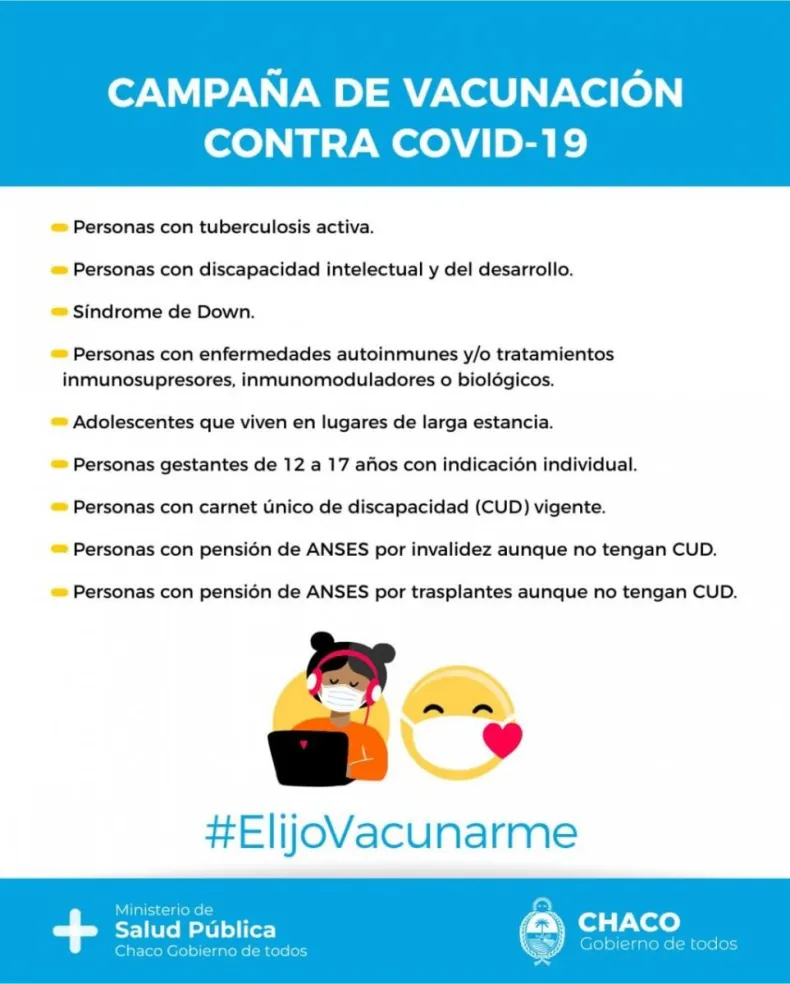 Así lo confirmó el Ministerio de Salud de la provincia y desde este viernes 30 de julio los niños, niñas y adolescentes de 12 a 17 años interesados en recibir la vacuna contra COVID-19 podrán ser registrados por sus tutores en la webhttps://elijovacunarme.chaco.gob.ar/.