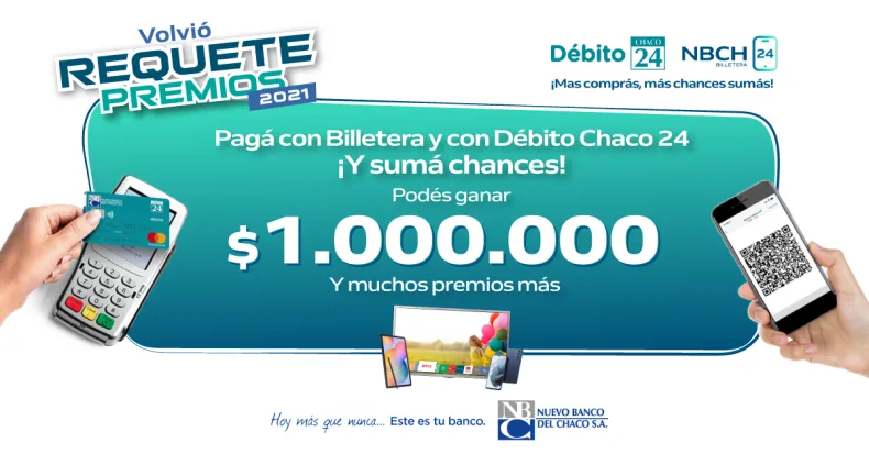 Desde el 1 de agosto y hasta el 28 de octubre, todas las compras realizadas con NBCH24 Billetera y con tarjeta de débito Chaco 24 de Nuevo Banco del Chaco participan de la promoción "Volvió Requetepremios 2021" y suman chances para el sorteo de $ 1.000.000 y los sorteos mensuales durante septiembre, octubre y noviembre.