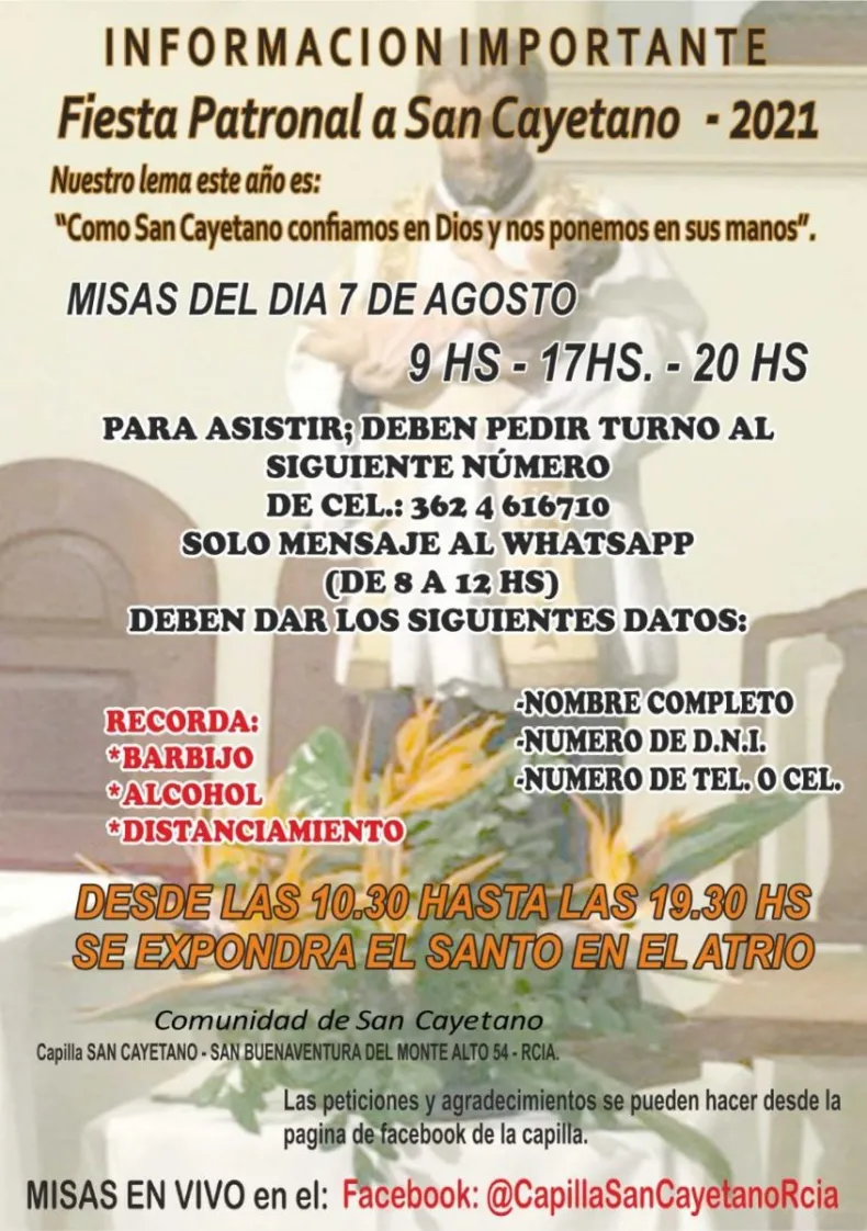 En cuanto a la celebración de las misas, desde las redes oficiales de la Capilla San Cayetano, ubicada en calle San Buenaventura del Monto Alto al 54, informaron que se realizarán tres misas durante el 7 de agosto: a las 9; a las 17 y a las 20.
