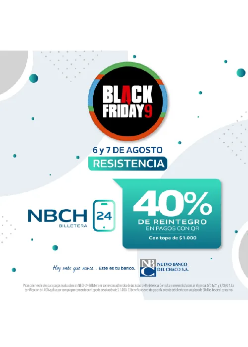 En la promoción Black Friday participan todos los rubros y todos los locales adheridos con la aplicación NBCH24 Comercios. El 40% de descuento lo aporta el Banco y aplica a pagos con QR, con tope de $1.000 de devolución. La acreditación de ventas es inmediata, sin costos ni cargos adicionales y comisión 100% bonificada.