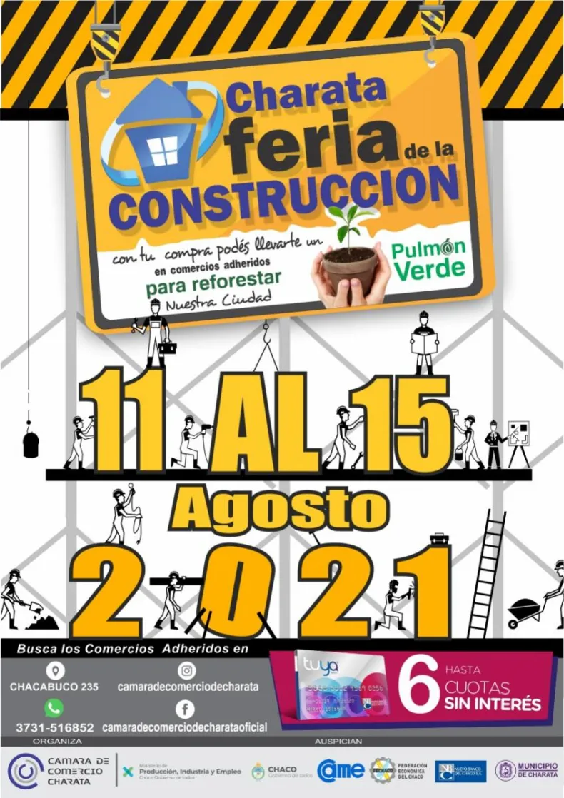 La Cámara de Comercio de Charata lanzó la Feria de la Construcción, que tendrá lugar del 11 al 15 de agosto con descuentos y promociones en todos los locales relacionados al rubro. Acompañan la campaña la Confederación Argentina de Mediana Empresa (CAME), la Federación Económica del Chaco (FECHACO), el Ministerio de Producción, Industria y Empleo, y el Nuevo Banco del Chaco, a través de Tarjeta Tuya.