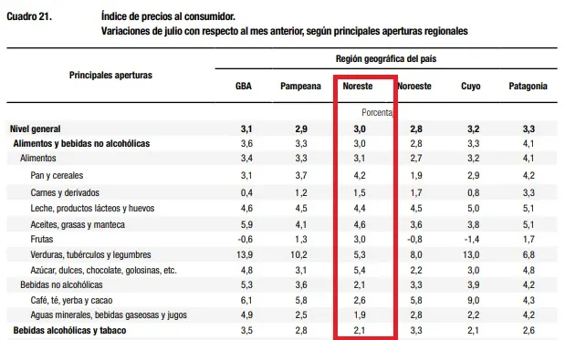 El INDEC dio a conocer esta tarde los últimos datos de la inflación de julio que en el noreste volvió a crecer y fue del 3% al igual que el promedio nacional. De esta manera, la región que integra la provincia lleva acumulada una suba del 27,3% y está a solo dos puntos de la inflación proyectada por Martín Guzmán.