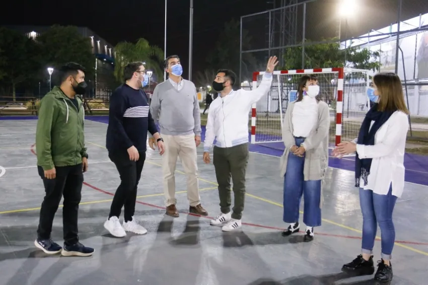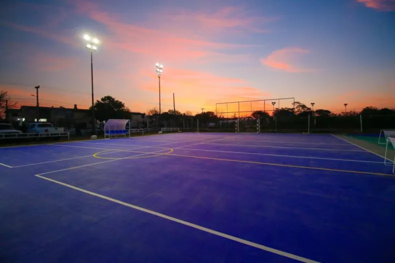 En cuanto al playón deportivo, se realizó la demolición y retiro de la totalidad del contrapiso reemplazándolo por uno totalmente nuevo, con hormigón de 10 centímetros de espesor, con refuerzo de malla electrosoldada de 15x15 cm y 6 mm. Para su acabado final, se aplicó pintura Epoxi de alta resistencia lo que permitirá que el playón sea utilizado para múltiples disciplinas. Para la refacción del cajón contenedor en canchas de beach vóley se retiraron la totalidad de las tablas que sirven de contención de la arena para reemplazarlas por tablones de quebracho colorado. Aquí también se refaccionó la pasarela de la cancha, para la cual se retiró la totalidad de las tablas de machimbre para instalar una malla de metal desplegado como piso lo que mejora la estructura anterior. Además, se construyó un sobre techo con chapa galvanizada y se instalaron canaletas de desagüe por fuera de las oficinas para evitar futuras filtraciones de agua.