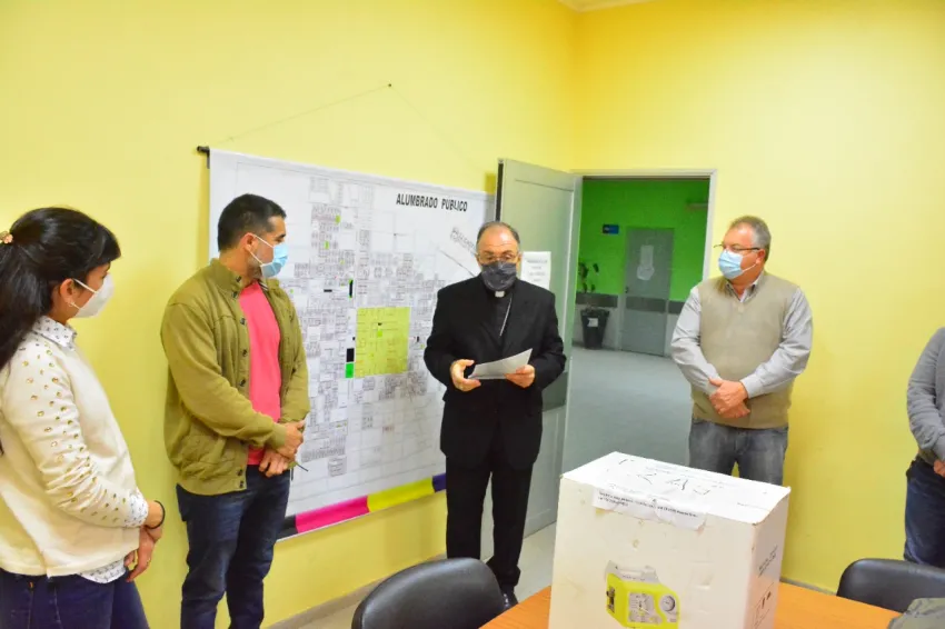El intendente Pío Sander junto a la Vicegobernadora Analía Rach Quiroga, la Subsecretaría de Salud Dra. Paula Sartor, el director del Hospital Dr. Felix Ruiz y el Secretario de Gobierno Ismael Pablo Barnes recibieron un respirador portátil que fue enviado por el Papa Francisco. La entrega estuvo a cargo del Obispo Monseñor Hugo Nicolás Bárbaro.