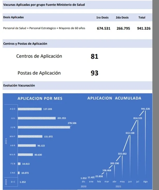 Finalmente, comentó que el plan de vacunación alcanzó la aplicación de 944.703 dosis y se prevé llegar a 1.150.000 dosis aplicadas para el 31 de agosto como meta entre ambas dosis.