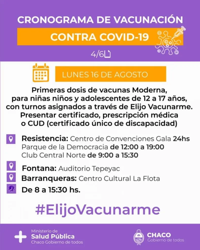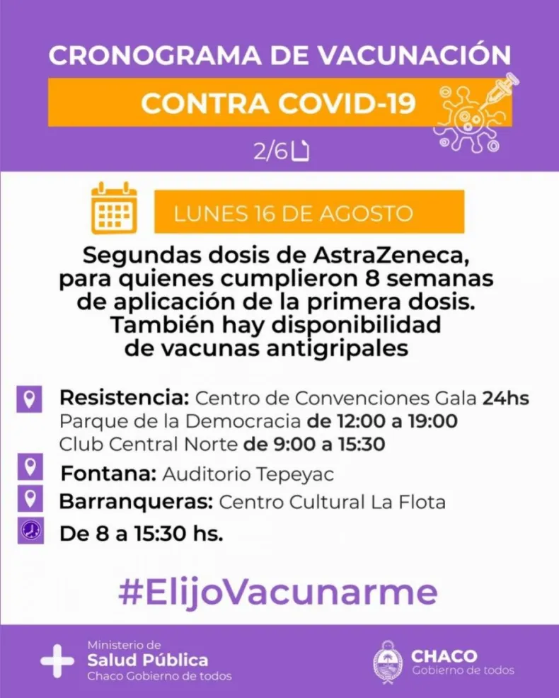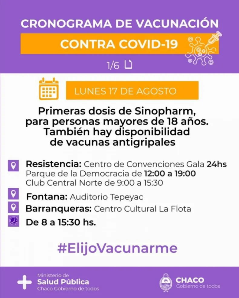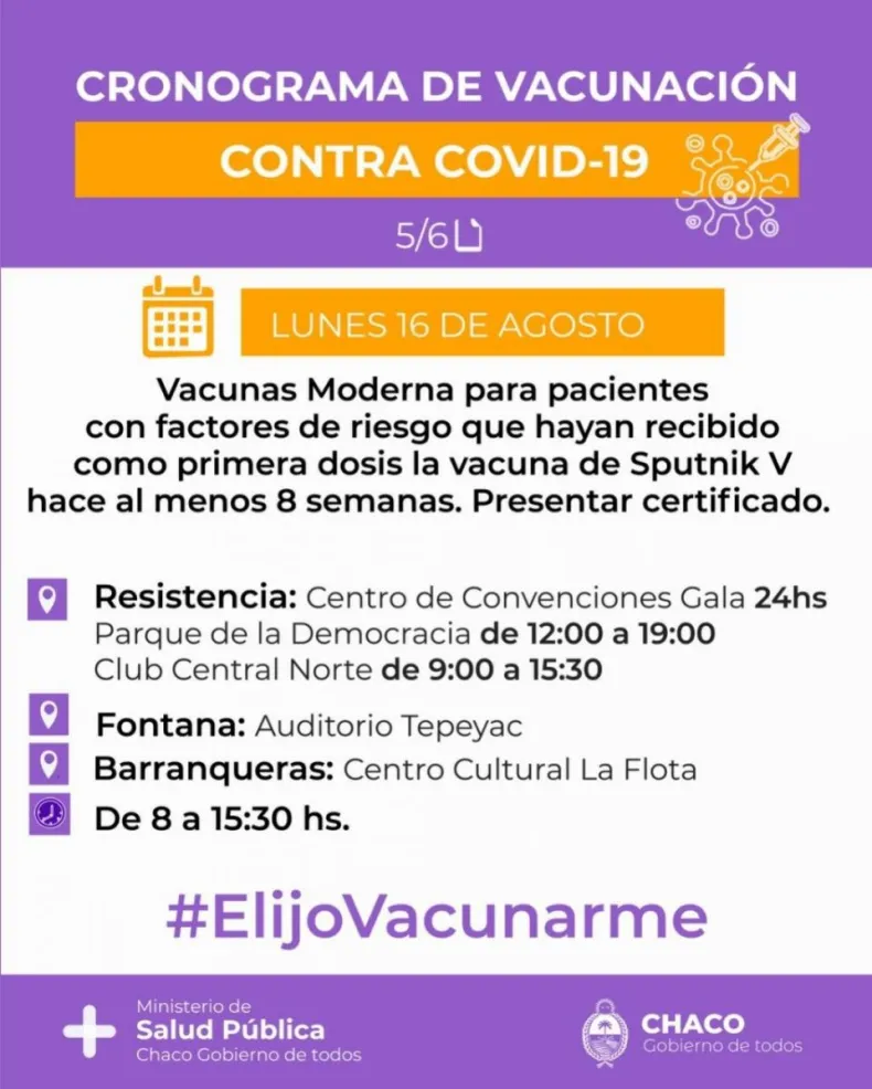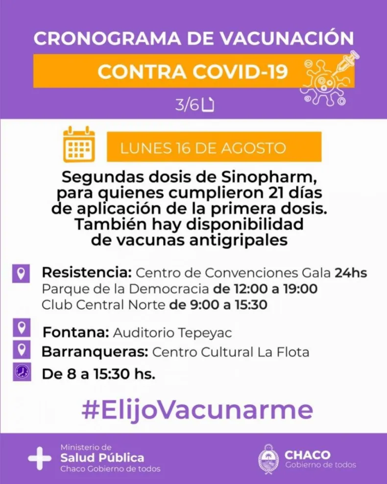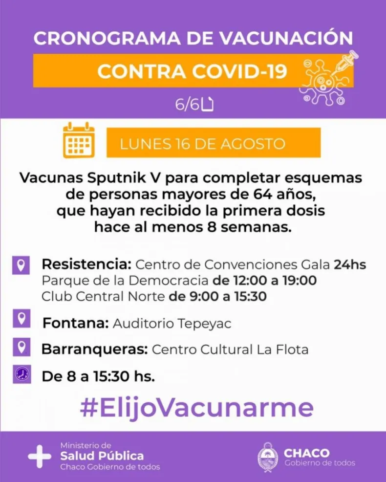 El Ministerio de Salud de la provincia del Chaco anunció el cronograma de vacunación contra el covid-19 que estará vigente hoy en las distintas postas de la provincia. El segundo componente de la Sputnik V para mayores de 64 años que hayan cumplido las 8 semanas de la primera dosis será aplicado hoy también.