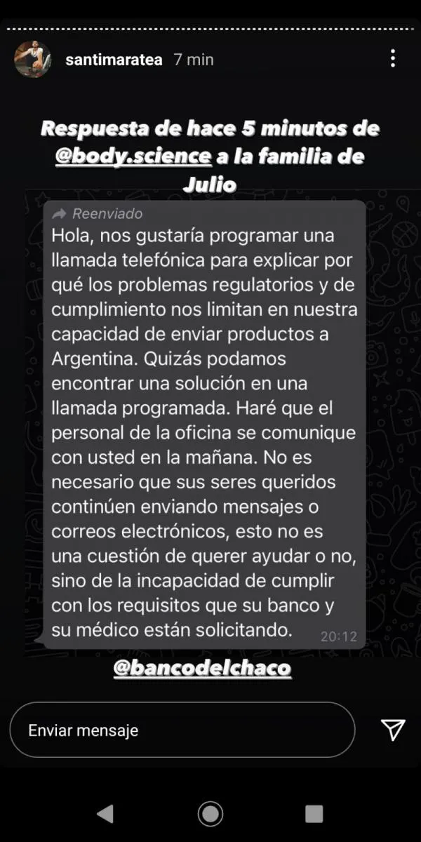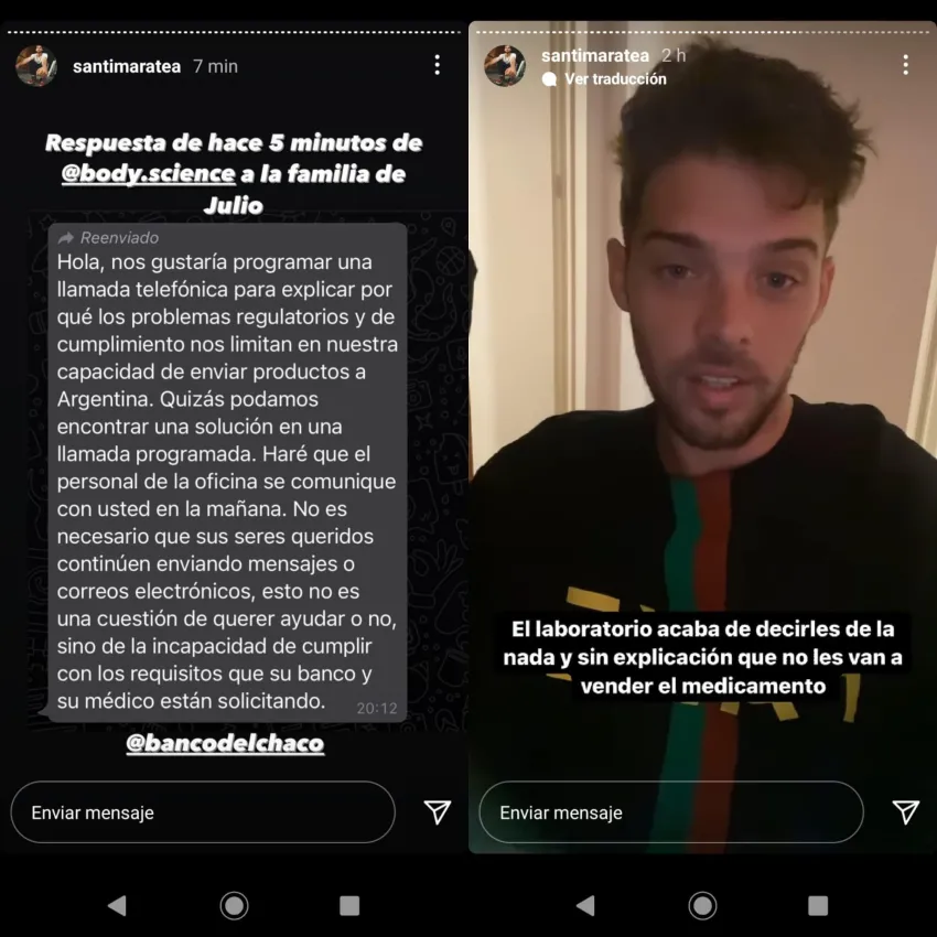 Luego de que el influencer Santiago Maratea suba historias a su perfil de Instagram explicando la situación desgarradora que le está tocando vivir a la familia de Julio Sosa por la no venta del medicamento por parte del laboratorio Body Science, finalmente estos se comunicaron vía mensajes.