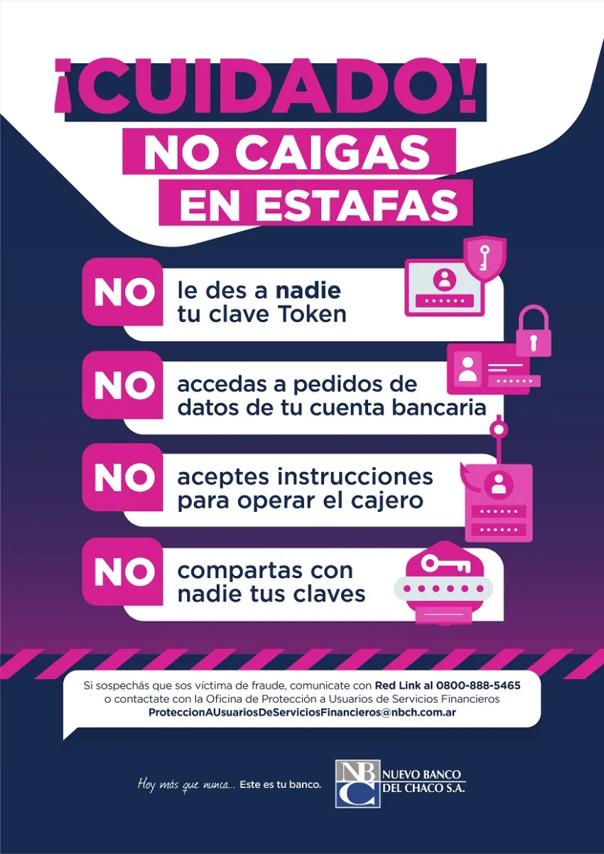 Es muy importante estar alerta porque cualquier persona puede ser víctima de estafadores. Por ello, siempre se debe tener en cuenta que Nuevo Banco del Chaco ni ninguna entidad oficial requerirá conocer la clave PIN, clave Token o credenciales de home banking para ninguna gestión, ni siquiera para bloquear la tarjeta. Si esto sucede, se debe reportar el hecho al 0800-888-5465 (Red Link) para bloquear el acceso a cuentas, realizar la denuncia en la comisaría más cercana y con la denuncia, presentarse en la entidad bancaria.