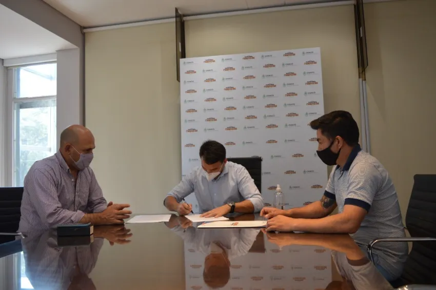 El presidente de Lotería Chaqueña, Gabriel Lemos y el intendente Marcelo Angione rubricaron el convenio que establece el financiamiento para esta obra que se inscribe en el Plan de Inversión y Desarrollo Deportivo, impulsado por el gobernador Jorge Capitanich.