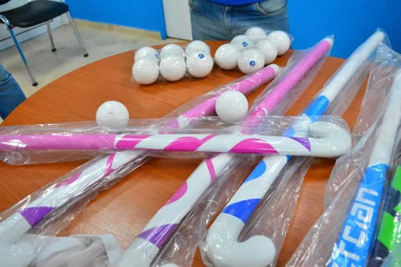 Rach Quiroga y Pío Sander entregaron elementos deportivos al club Abipones Hockey de Castelli