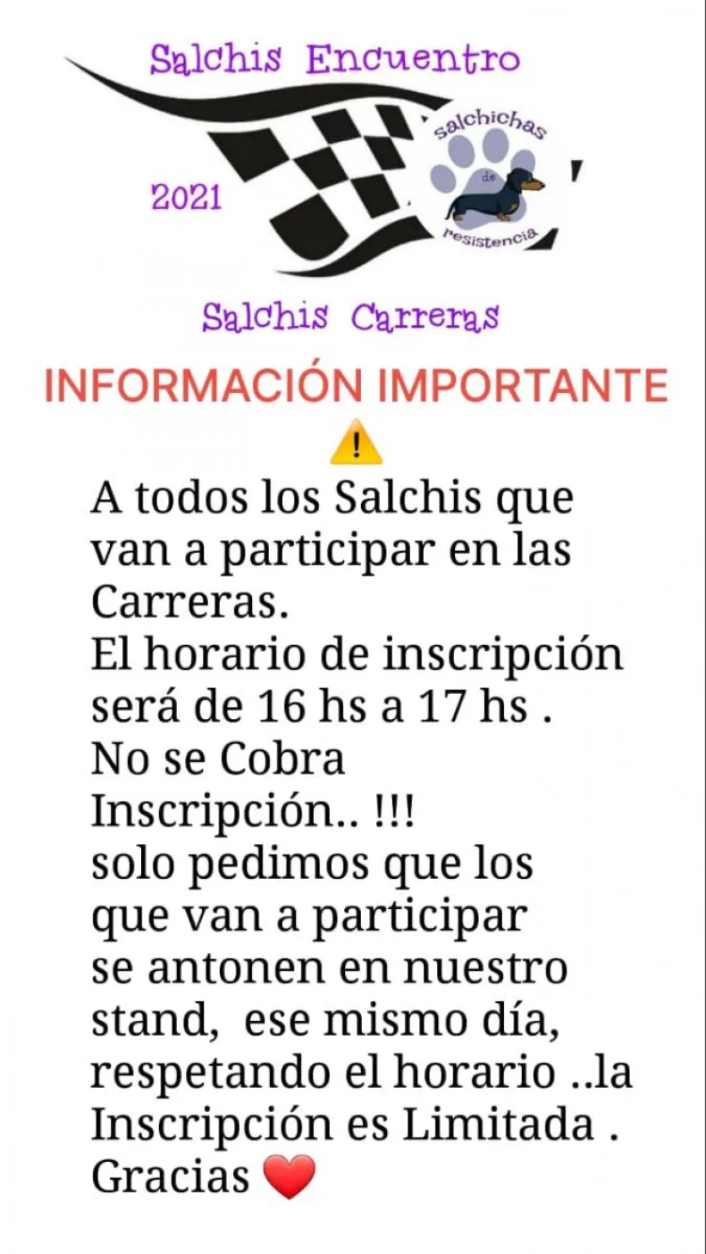 En cuanto a la participación las personas que quieran hacer, lo podrán realizar de manera libre y gratuita inscribiéndose ese mismo día de 16 a 17 en el lugar. El único requisito es que se necesitan dos adultos responsables por cada perro salchicha inscripto.