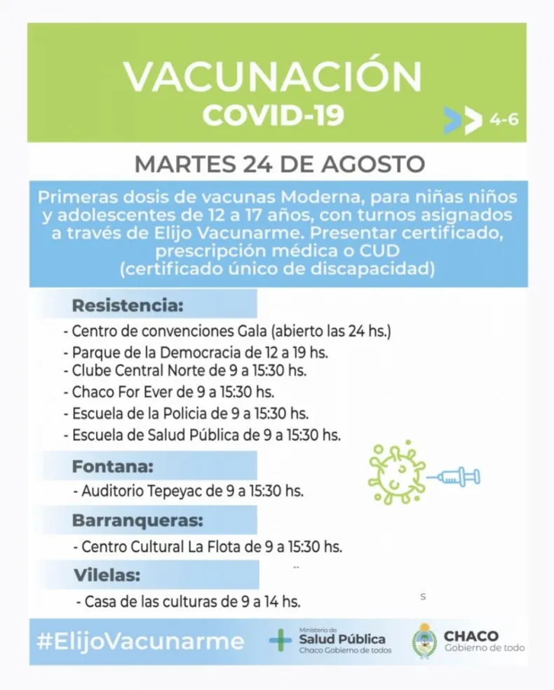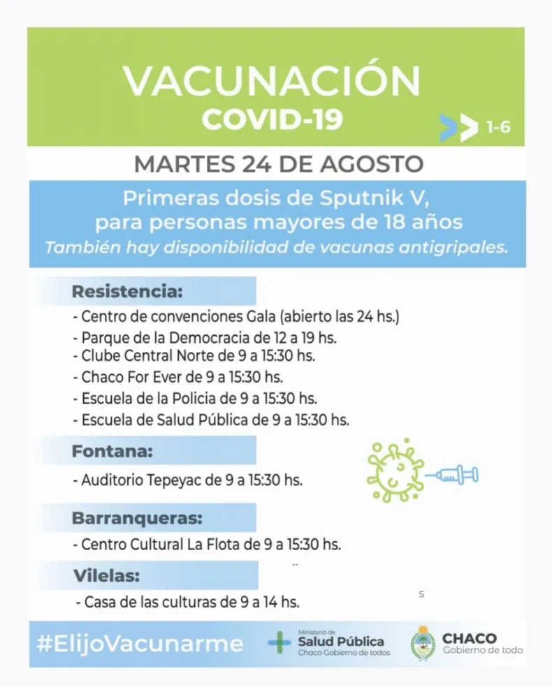 Entre las distintas postas y destinatarios, se destaca la continuidad de la inoculación para mayores de 18 años con la primera dosis de la vacuna rusa. En total hay 9 postas habilitadas en el Gran Resistencia