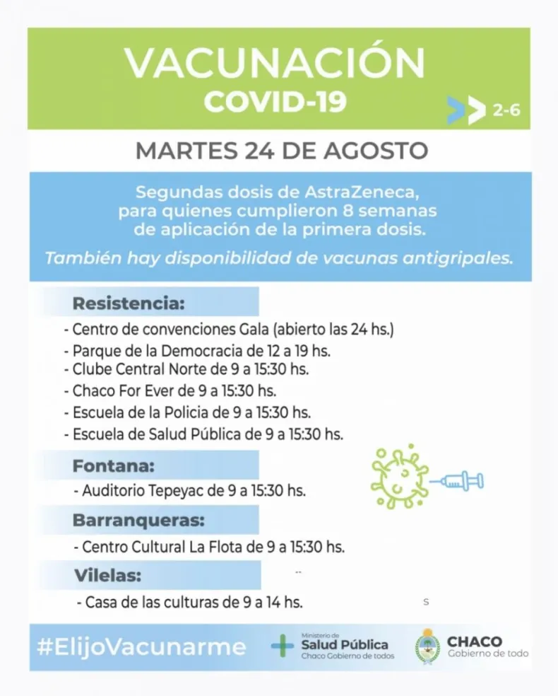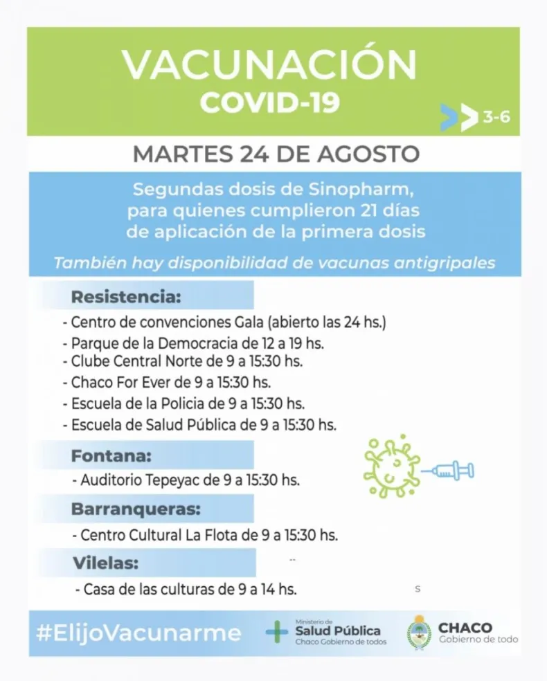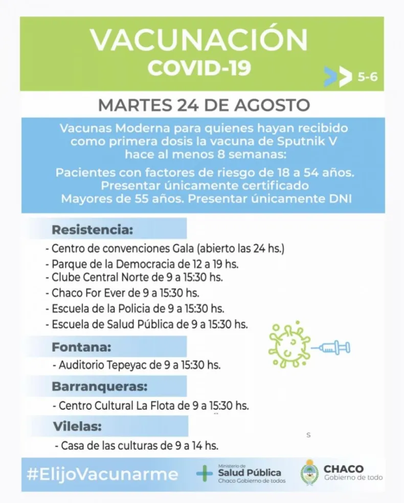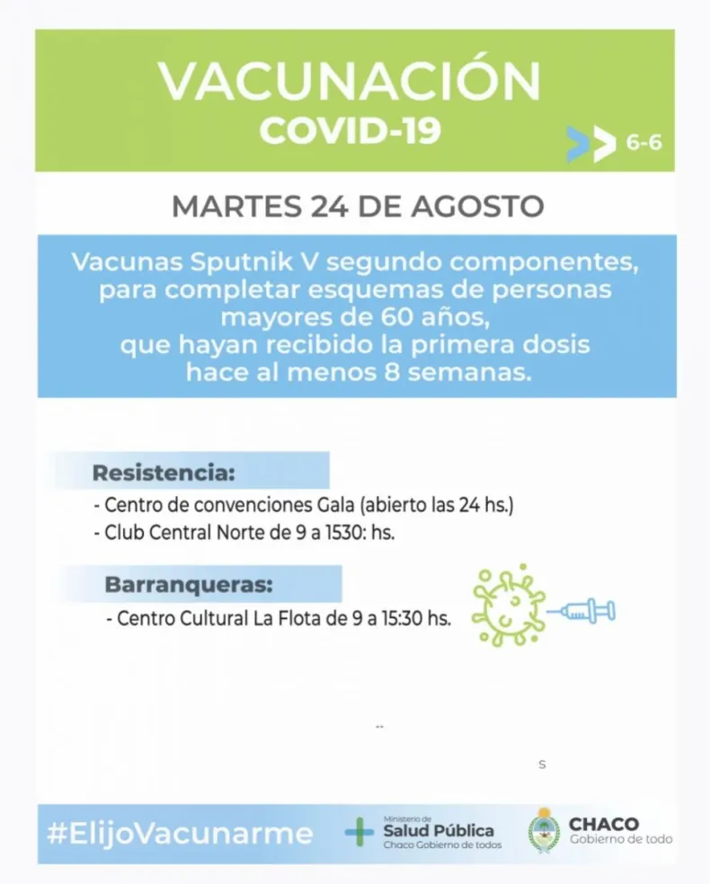 Este martes, en el Club Central Norte, Centro de Convenciones Gala y el Centro Cultural La Flota de Barranqueras aplicarán el segundo componente de la vacuna Sputnik V a mayores de 60 años que hayan recibido la primera dosis hace al menos 8 semanas.